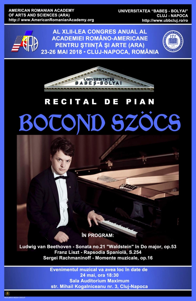 Pianistul Botond Szöcs, în vârstă de 22 de ani, s-a făcut remarcat în lumea muzicală graţie temperamentului energic inconfundabil, potenţat de intensitatea trăirilor artistice şi manifestat prin forţa persuasivă a interpretării. Student la Facultatea de Muzică din cadrul Universităţii Transilvania din Braşov, la clasa prof. univ. dr. Stela Drăgulin, Botond a participat la concursuri naţionale şi internaţionale. După câştigarea a peste 12 premii I, cea mai recentă recunoaștere,  obţinută în 2017, este Premiul de Excelență în Muzică al Academiei Americano-Române pentru Ştiinţe şi Arte pentru cel mai bun interpret  în calitate de solist, membru al unui ansamblu de muzică de cameră sau acompaniator. (American Romanian Academy for Arts and Sciences  Music Award for Excellence –The Best Concert Performer as a Soloist, Member of a Chamber Music Ensemble and Accompanist.)